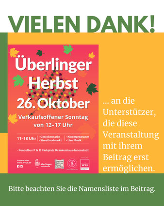 Wir bedanken uns ganz herzlich bei den folgenden unterstützenden Unternehmen, die durch ihren wertvollen Beitrag den ÜBERLINGER HERBST mit verkaufsoffenem Sonntag am 26. Oktober 2025 mit ermöglichen: